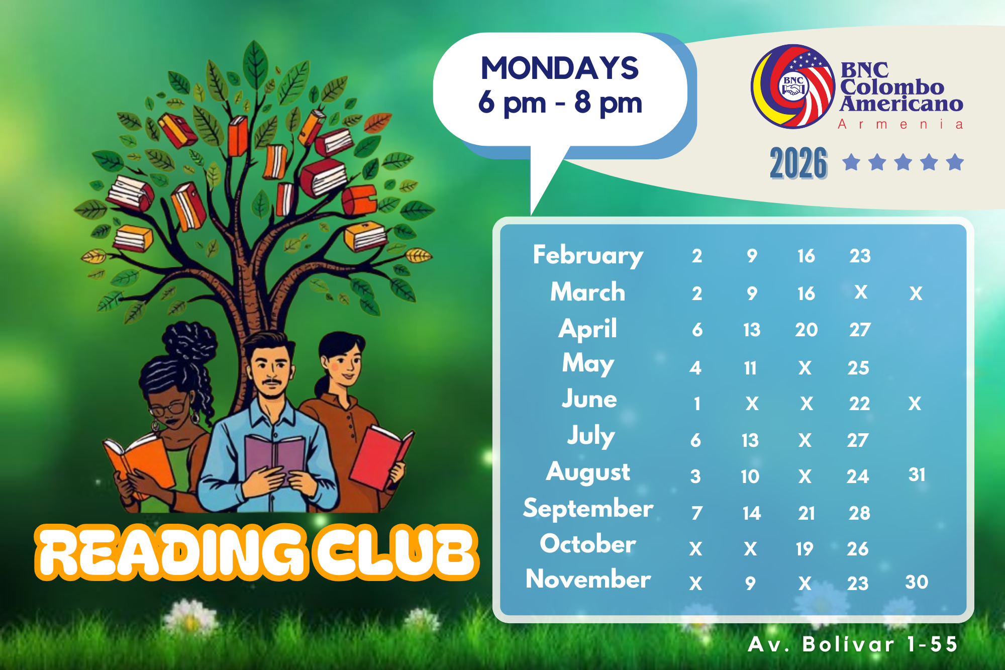 Con el objetivo de fortalecer y mejorar las habilidades comunicativas en inglés de estudiantes y público en general, el BNC Colombo Americano Armenia organiza el Club de Lectura / Reading Club en la biblioteca Dixie Gentry, ubicada en la sede de La Castellana (Calle 13N #13-50).